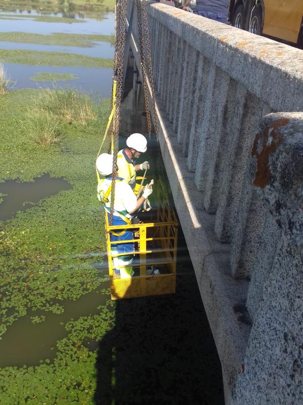 Continúa la reparación en la tubería colgante del Puente de la Universidad de Badajoz, que obliga a cortar un carril al tráfico