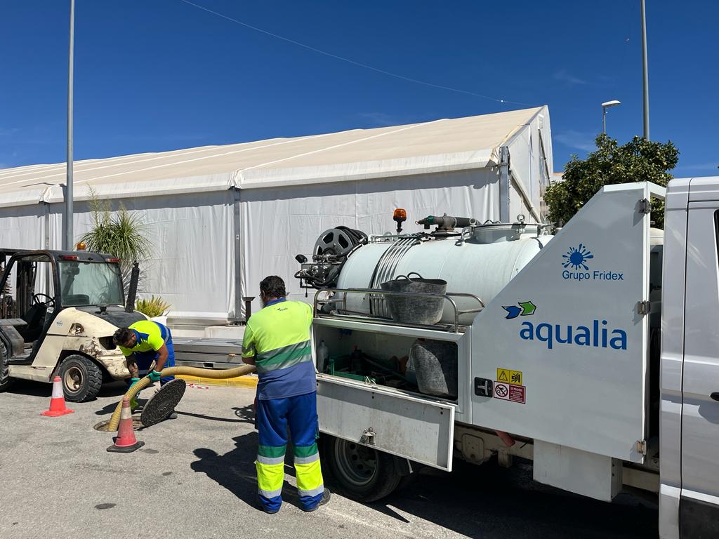 Aqualia viene realizando desde hace días una limpieza global de los imbornales y acometidas del ferial y zonas aledañas para evitar atascos en el sistema de drenaje durante las fiestas